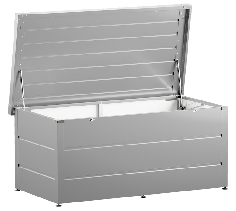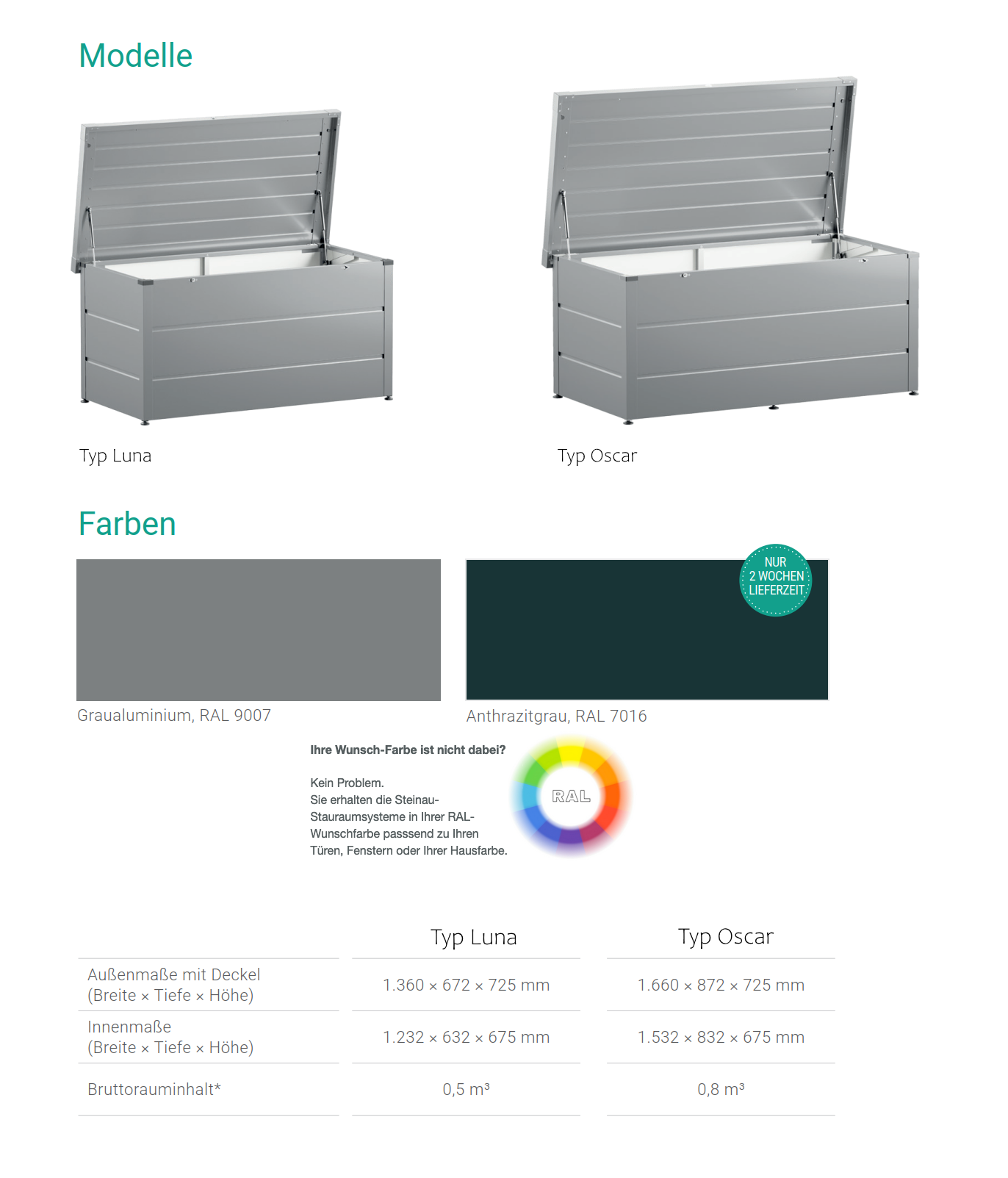 Unsere Gartenboxen sind in zwei Farben erhältlich: Graualuminium (RAL 9007) oder Anthrazitgrau (RAL 7016). Die Innenseite ist immer Grauweiß (RAL 9002). Sie werden aus verzinktem, hochwertig lackiertem Stahlblech regenwasserdicht hergestellt.